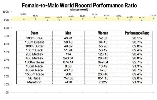 Rekor dunia perempuan adalah 90 persen dari rekor dunia pria, pada lari